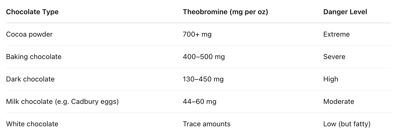 Dark chocolate, cocoa powder, and baking chocolate contain the highest levels of theobromine, making them the most dangerous. Milk chocolate, while lower in theobromine, can still be harmful – especially in small dogs. White chocolate contains only trace amounts of theobromine but is high in fat and sugar, which can cause stomach upset or trigger pancreatitis.